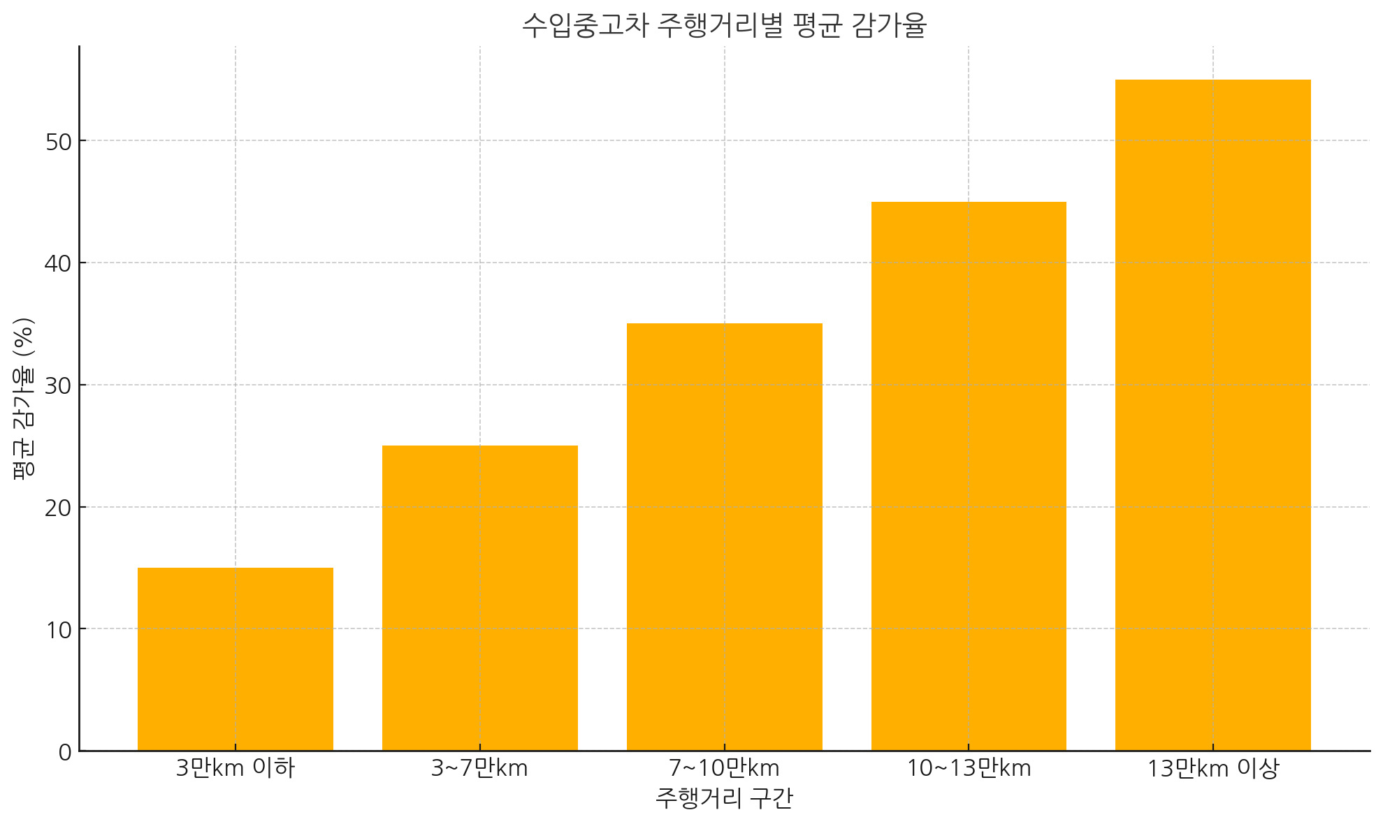 수입중고차는 7만km, 10만km, 13만km 구간에서 감가상각폭이 크게 발생합니다. 보통 7만km를 넘기면 시장 가격이 500만~1,000만 원 하락하며, 10만km를 넘기면 다시 10~20% 이상 가격이 떨어집니다. 13만km 이상이면 매물 자체가 거래되는 빈도가 급감하고, 판매자 입장에서 매각이 어려워집니다.