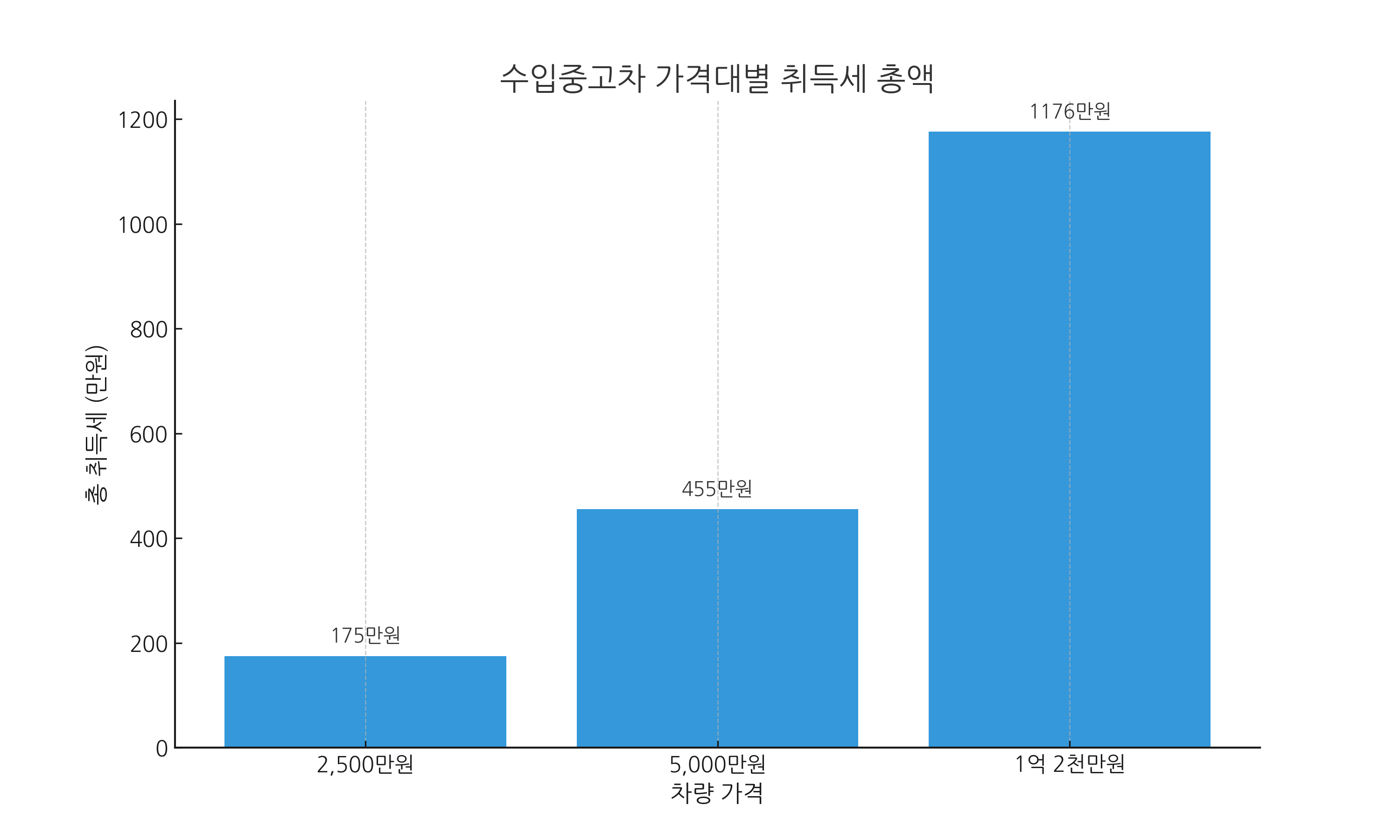 3천만 원 이하 수입중고차는 비교적 저렴한 편에 속해 취득세율 7%만 적용됩니다. 예를 들어, 2,500만 원짜리 수입 중고차를 구매했다면 취득세는 약 175만 원(2,500만 원 × 7%)입니다. 추가 세금은 발생하지 않습니다.