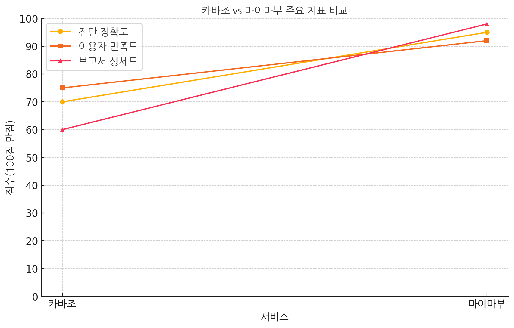 카바조는 '진단 결과를 바탕으로 매입가를 조율'하는 구조라 일부 항목은 내부 기준으로 조정될 수 있어요. 마이마부는 '고객에게 최대한 객관적인 정보 제공'이 목적이기 때문에 문제를 더 부각시킬 수도 있죠. 다시 말해, 같은 문제라도 카바조는 '이 정도면 괜찮아요'라고 할 수 있는 반면, 마이마부는 '이건 수리비가 꽤 들어가겠네요'라고 말할 수 있다는 거예요.
