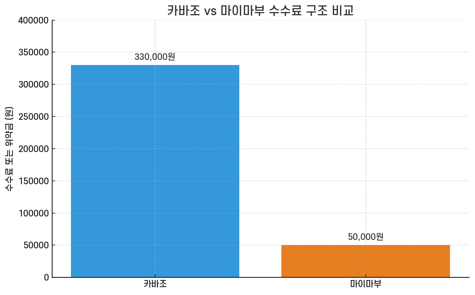 직접 비교해본 결과, 카바조와 마이마부의 수수료 체계는 단순 가격 이상의 차이가 있습니다. 가장 먼저 확인해야 할 건 ‘수수료가 언제, 어떻게 발생하느냐’인데요. 카바조는 경매 플랫폼 형태로 운영되며, 입찰이 성사되고 계약이 진행될 경우에만 약 33만 원 수준의 정액 수수료가 발생합니다.